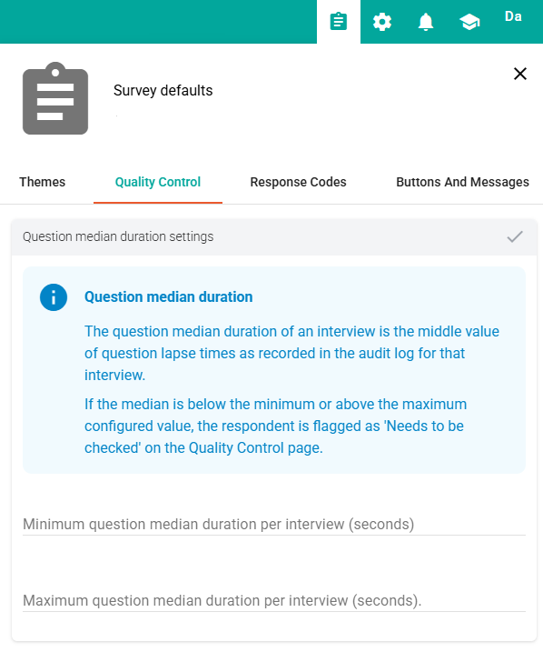 We have now extended the Question Median Duration feature to the domain level. This means that if your domain has the Question Median Duration settings (in the picture below) configured, any surveys within that domain will automatically inherit those values. However, if needed, you can still override and customize these values at the survey level.